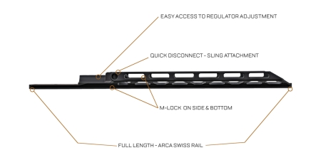 The SKOUT® ARCA rail accessory for the EVO® features a full length ARCA rail from the front of the bottle, all the way back to the trigger guard. Along the sides and bottom are industry standard M-LOK connections – allowing for use of fire-arm industry attachments without adapters. Additionally the rail provides connectivity for a sling mount (one on each side), and is constructed from a single piece of billet aluminum, secured by stainless hardware.